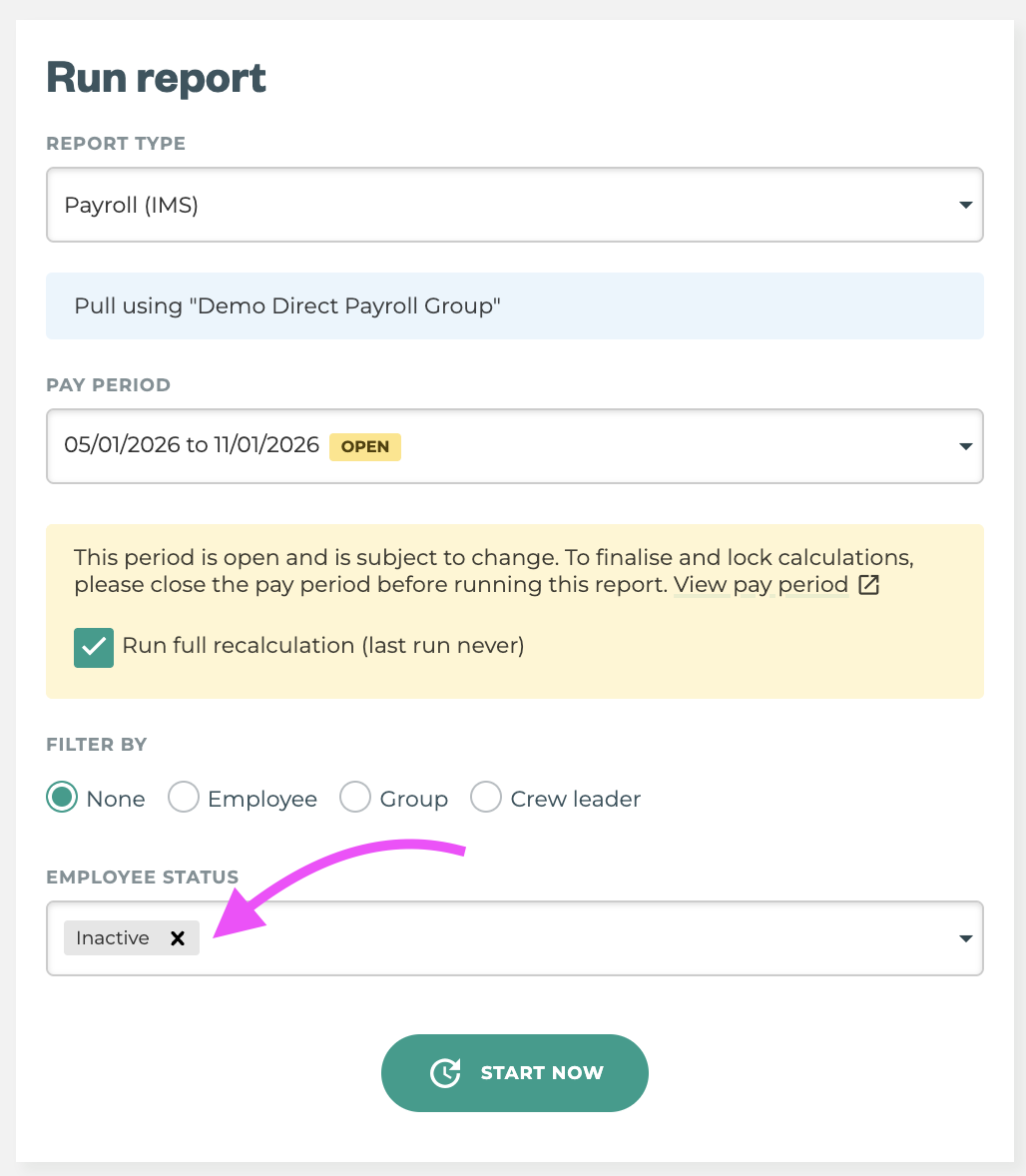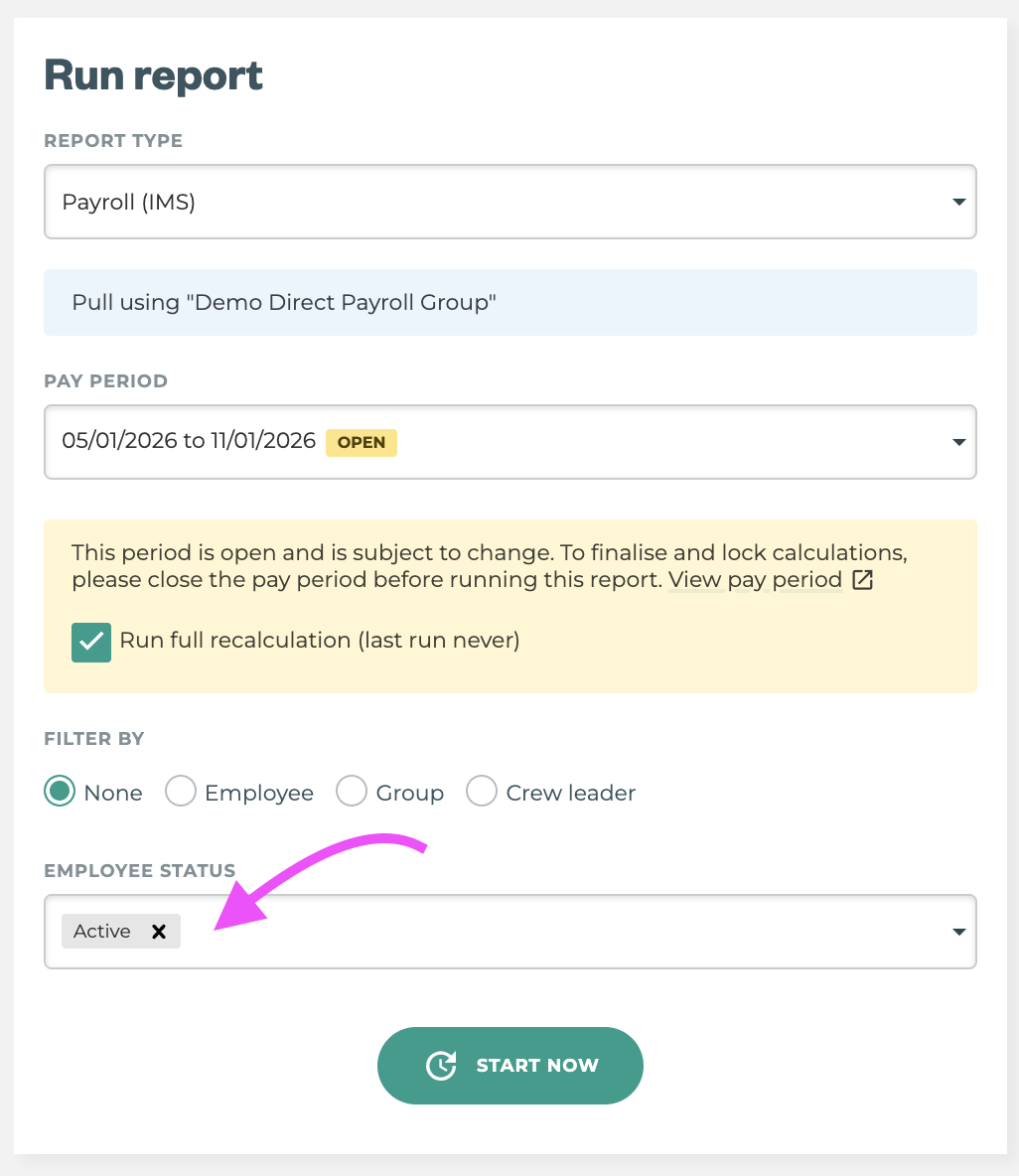 Payroll reports now include an Employee Status Filter dropdown. It defaults to both active and inactive employees but can filter for those leaving (inactive status) to run a final pay outside the normal cycle.