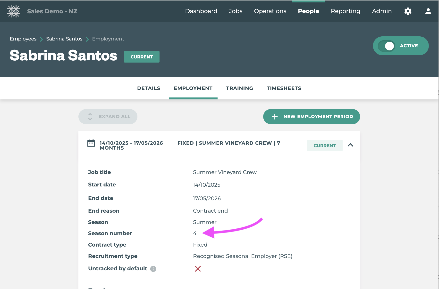 Employee experience can play a role in an employee’s earnings under both NZ and AU labour laws. To aid customers tracking this information in Tātou, we’ve added an Employee Season Number to each Employment Period. This number can either automatically calculate based on an employee’s unique Employment Periods, or can be manually updated to ensure it captures past seasons not captured in Tātou.