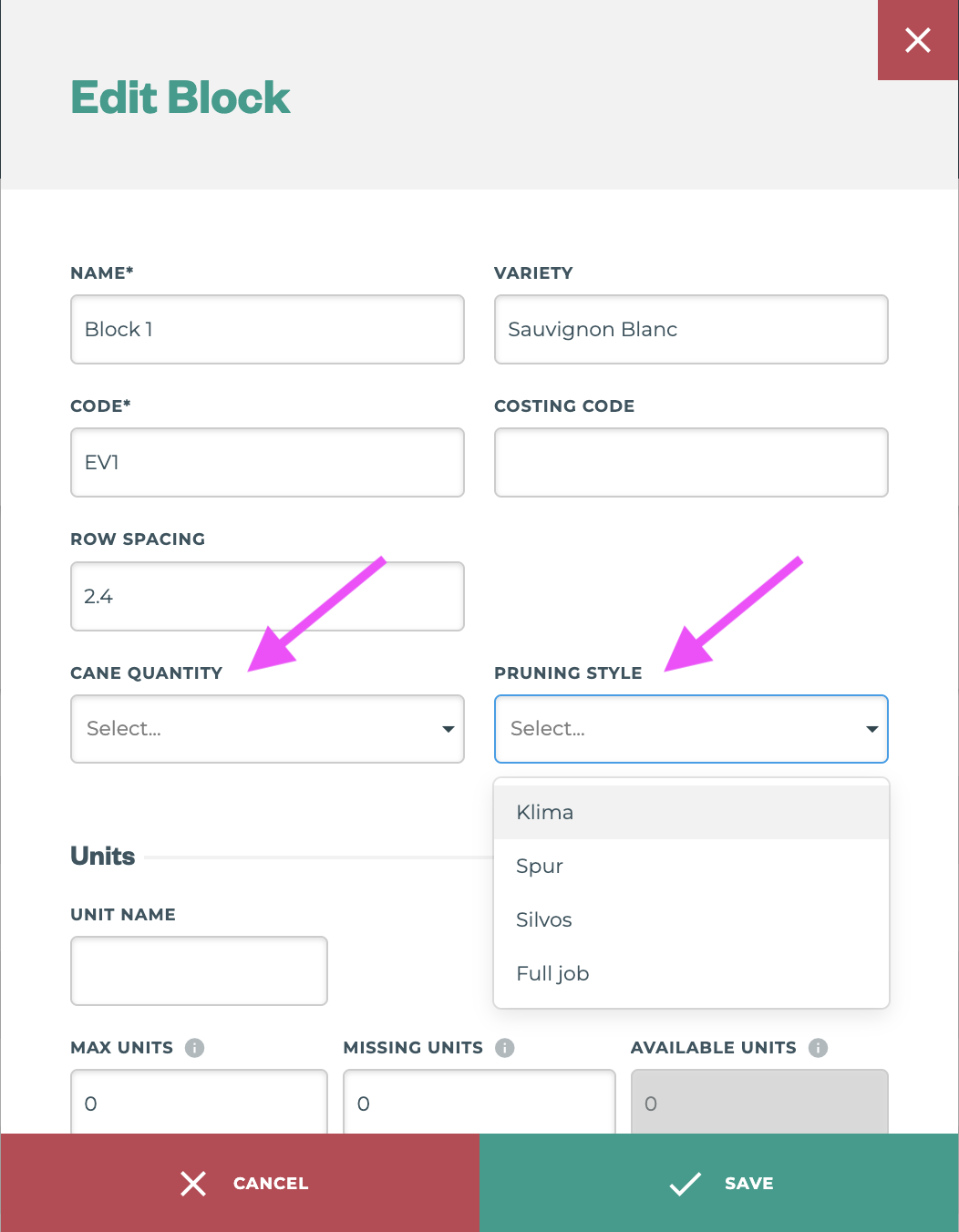 In preparation for viticultural pruning season we’ve added two new Block details: pruning_style and cane_number. These values are at the block level, and can be used to help filter blocks when creating projects, and will be added to the Productivity Dashboard as grouping tools to help managers keep a more detailed eye on pruning costs by type and or cane number.