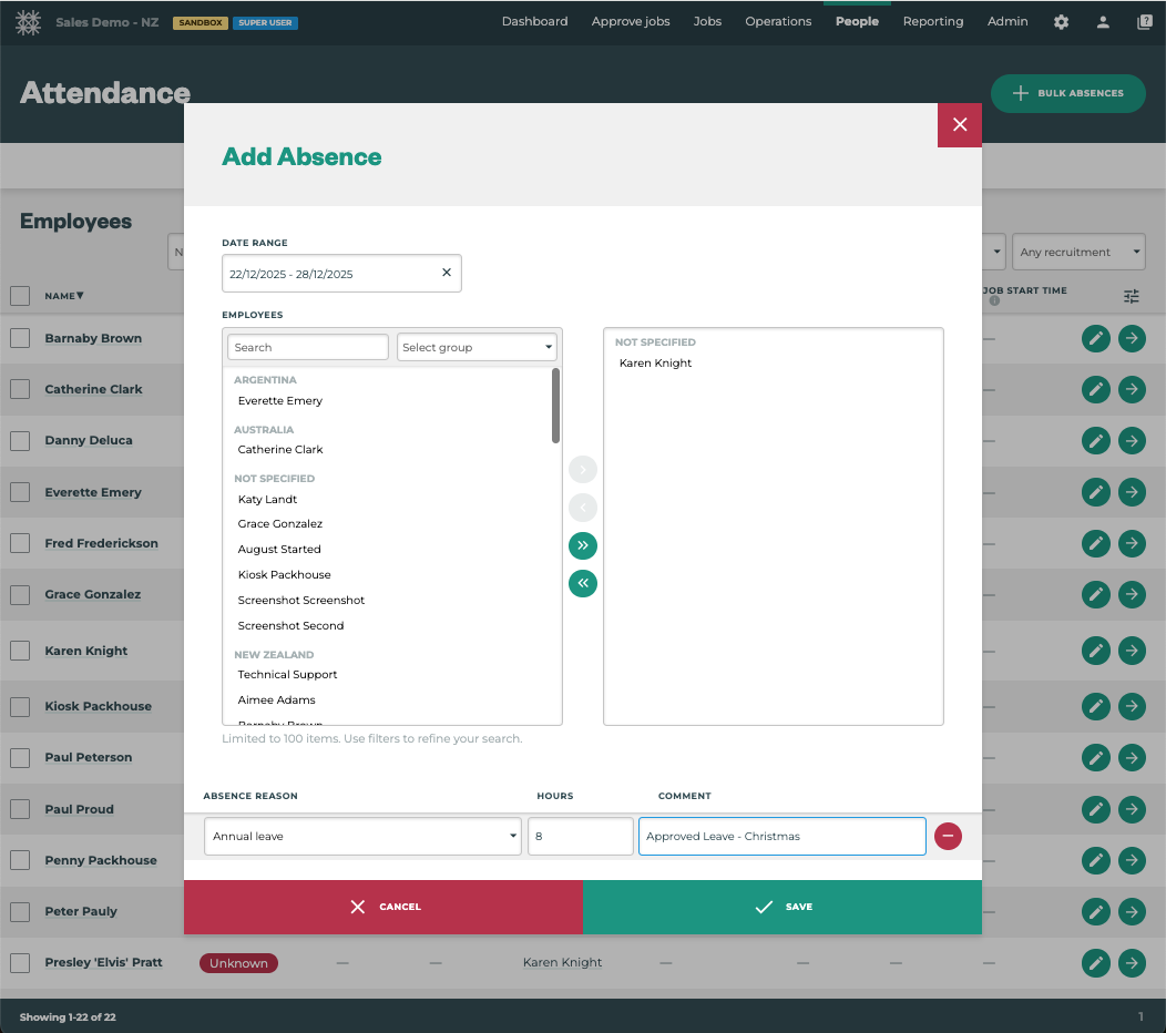 Tātou Office App Users with Attendance permissions can now add Absences in Bulk!