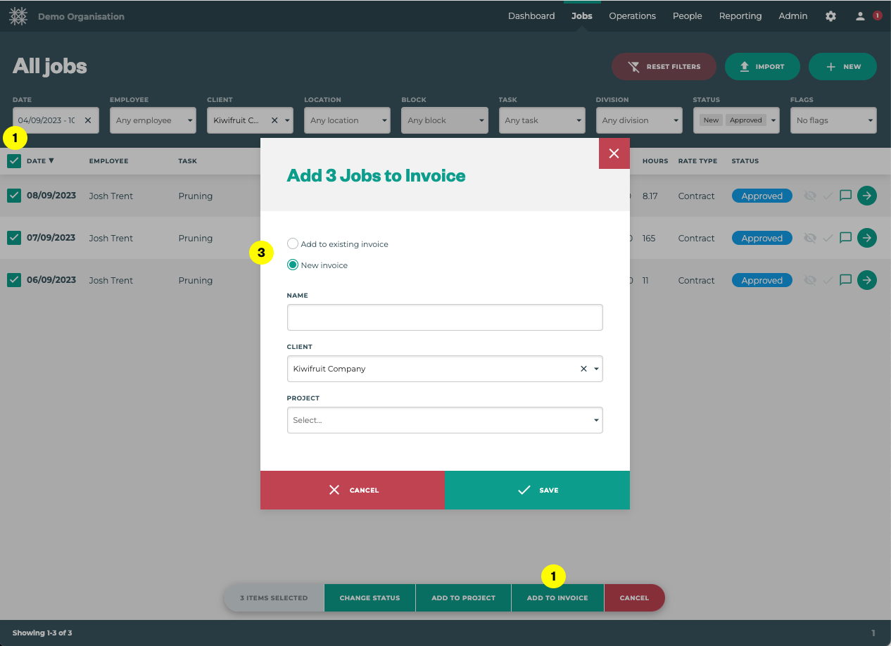 Using the checkboxes on the left hand side, select the jobs you would like to invoice