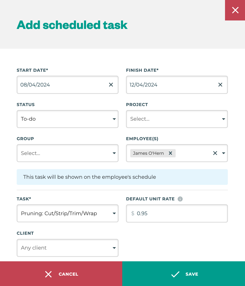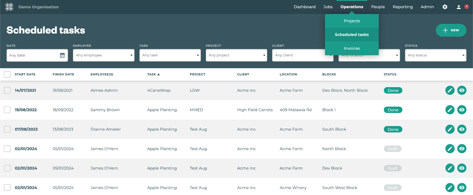 A scheduled task contains relevant information about the work to be completed, such as the Task, Location, Employee, status and due date.