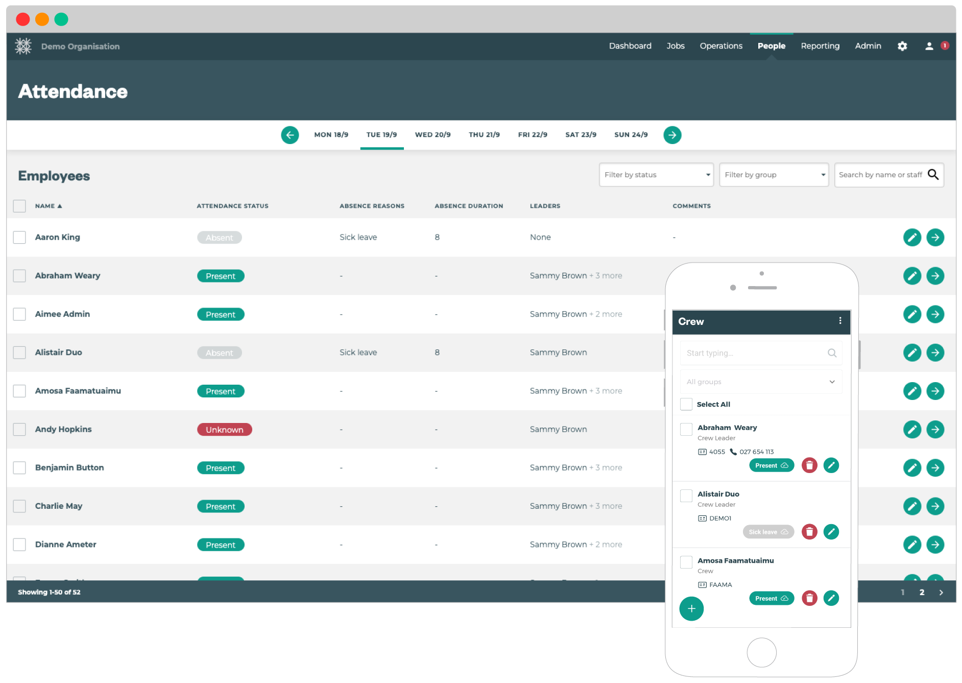 Field app users (e.g. Supervisors) can inform the Office app immediately with any absences or presences for the day.