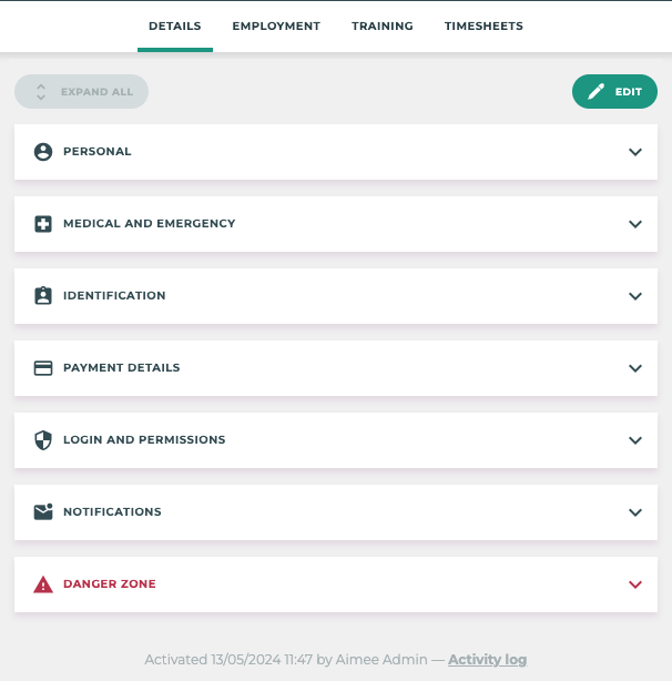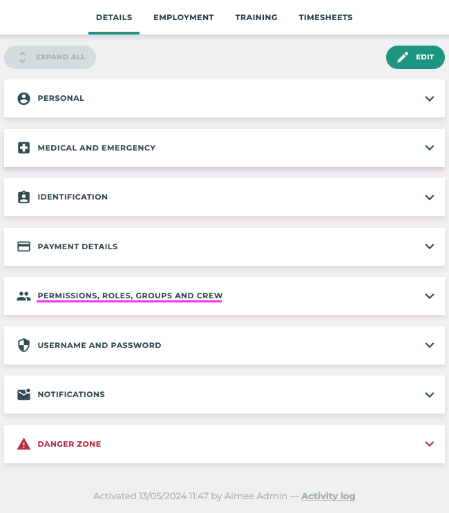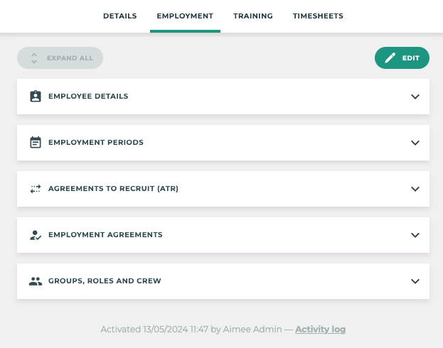 ![]() Groups, Roles and Crews will now be a part of the DETAILS section of the employee profile. | ![]() The EMPLOYMENT section will now be comprise of 1 or more Employment Period drop downs. These employment period sections are a combination of: