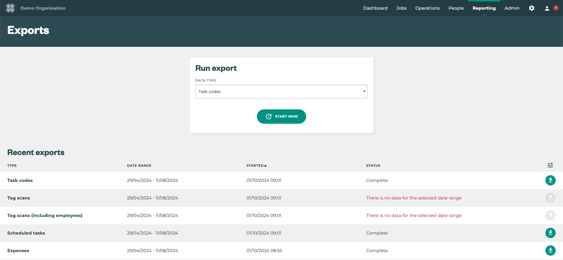 The Exports page is the landing page for exporting organisational information stored in Tātou.
