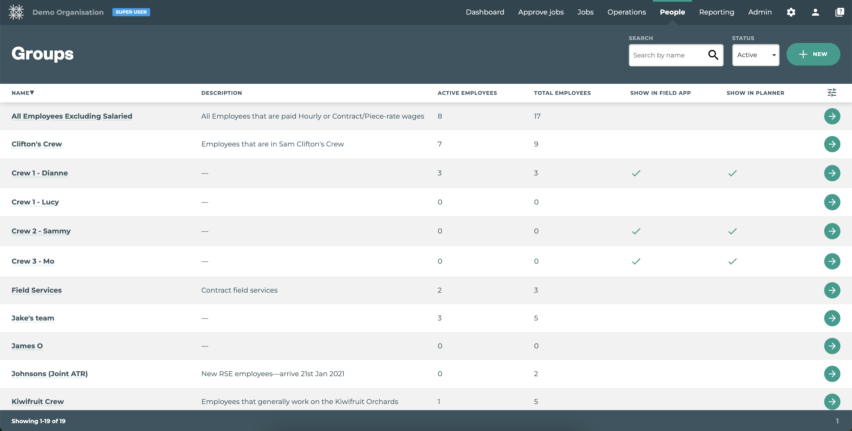 Groups = A filtering tool to help users of both the Tātou Field and Office Apps quickly locate, report on, bulk edit employee information, or filter a number of dashboards, reports, and pages. Employees can be in multiple groups, and groups can be made Active or Inactive.
