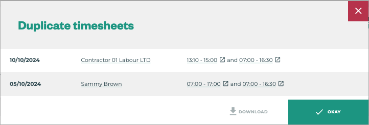 Duplicate Timesheets: Clicking the number under the Duplicate Timesheets header will bring up a downloadable pop up that lists: