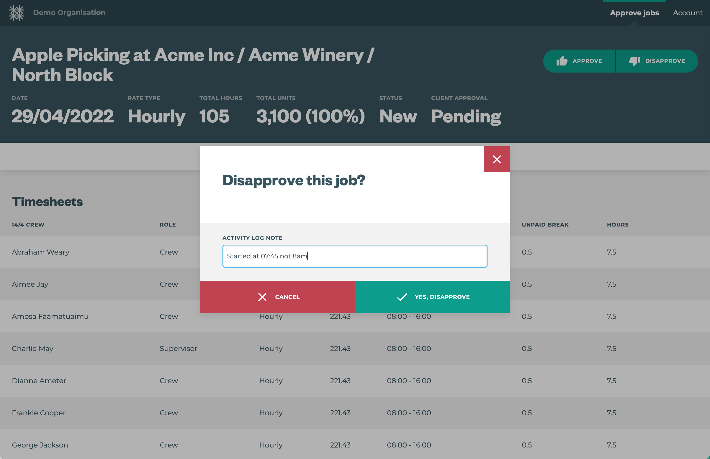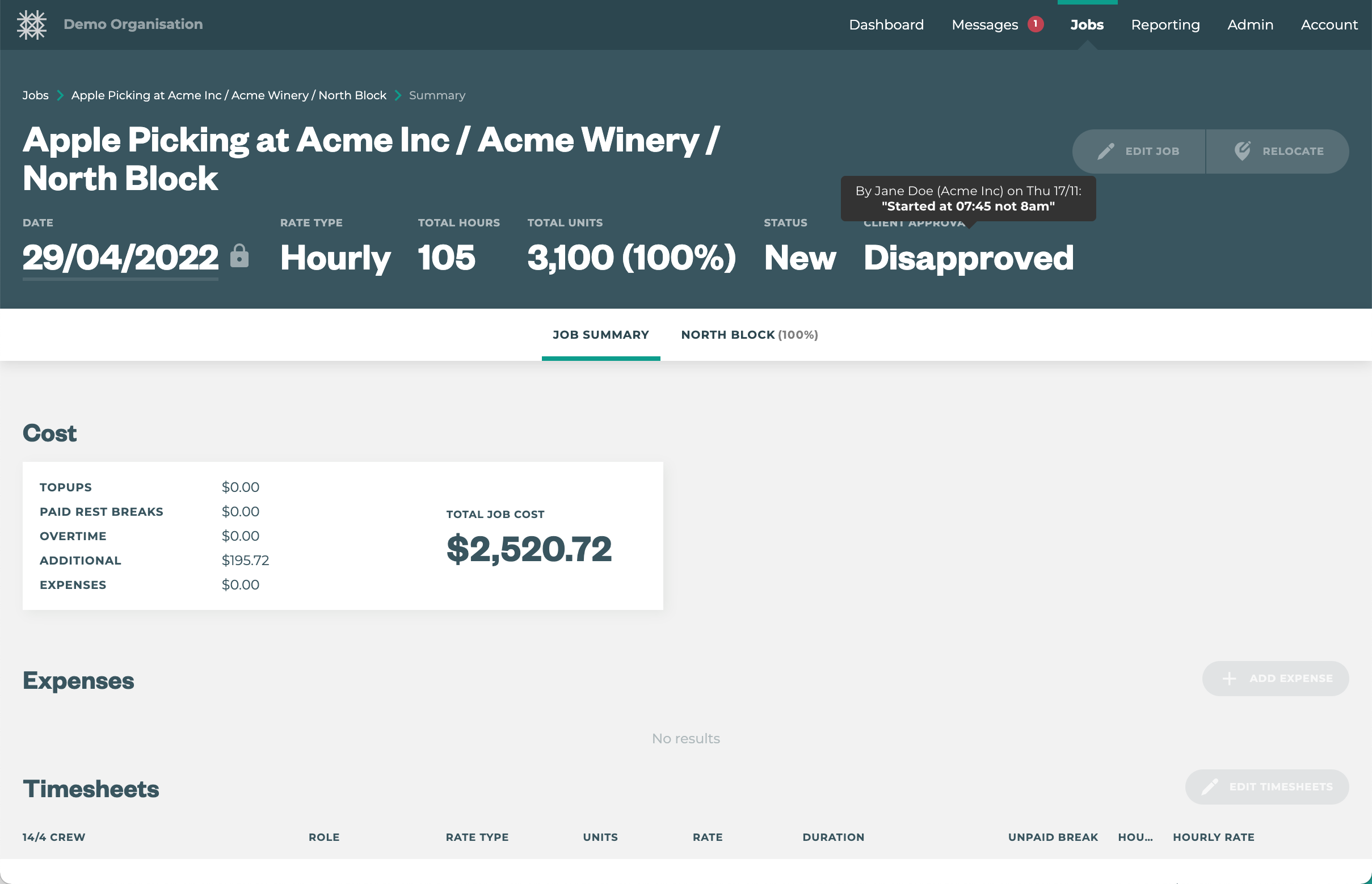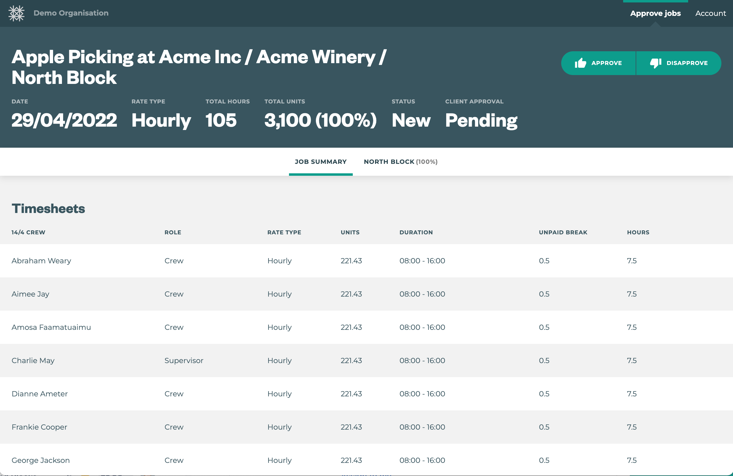 ![]() | A job summary is displayed at the top including total hours and total units as well as percentage complete. Timesheets are displayed including crew names, units and hours, breaks etc. All rate values are hidden |