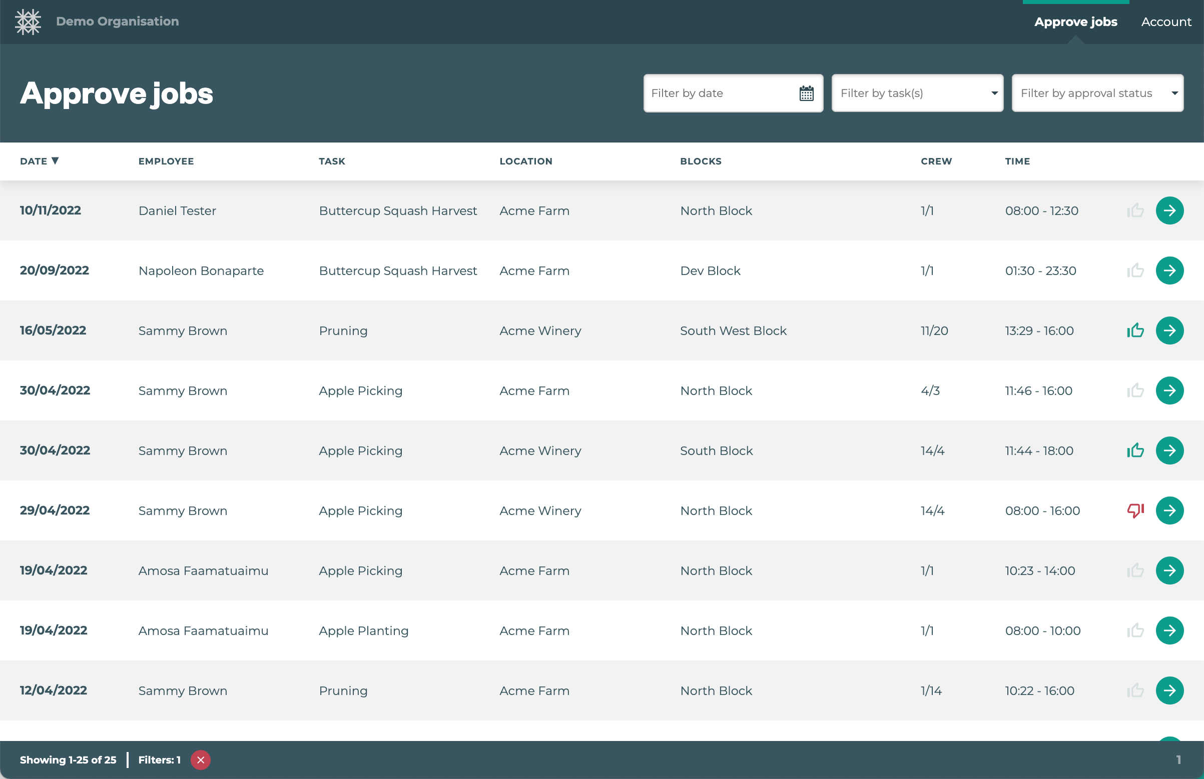 5. If jobs are approved, great! They’re ready for payroll or invoicing. If jobs are disapproved, edit the job as required and revert the status back to a) ‘Draft’ to hide the job again or b) revert the status back to ‘Ready’ to prompt the Client to review again. | |||
