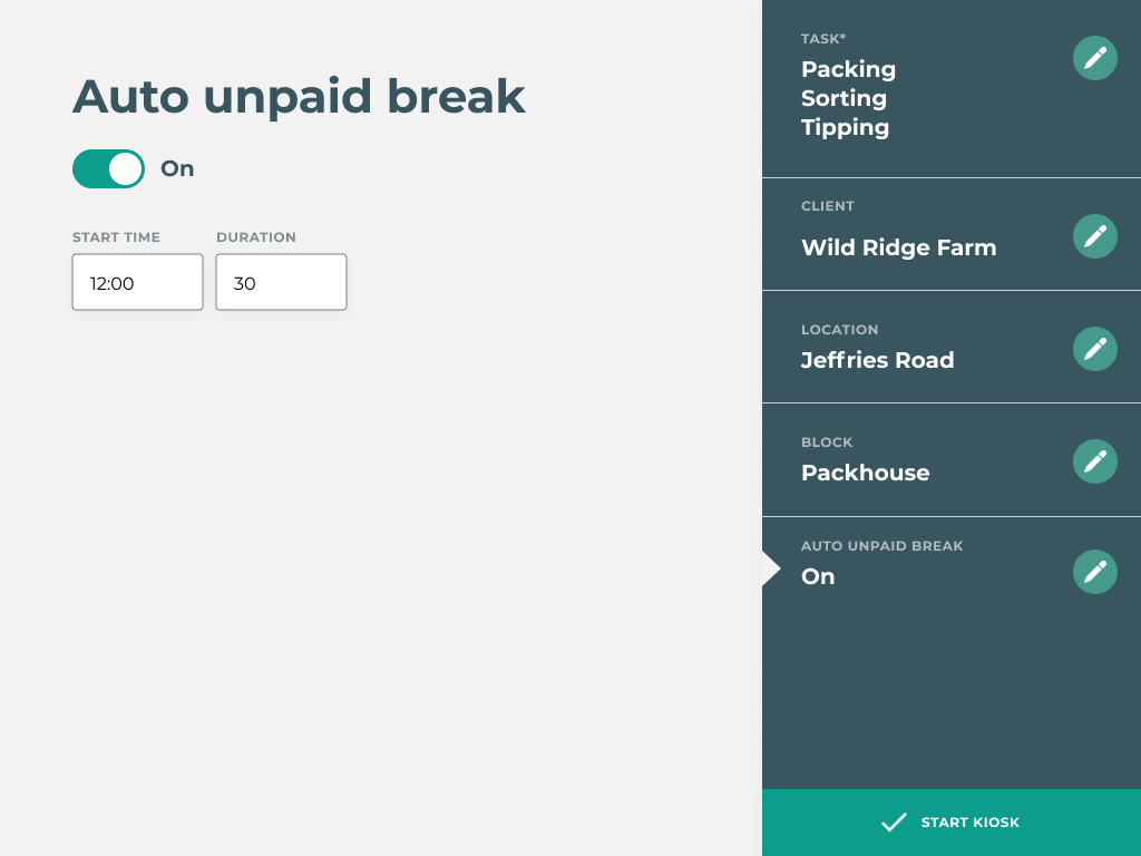 Off = Requires the employee to return to the Kiosk to ‘Start break’ and ‘Finish break’ themselves
