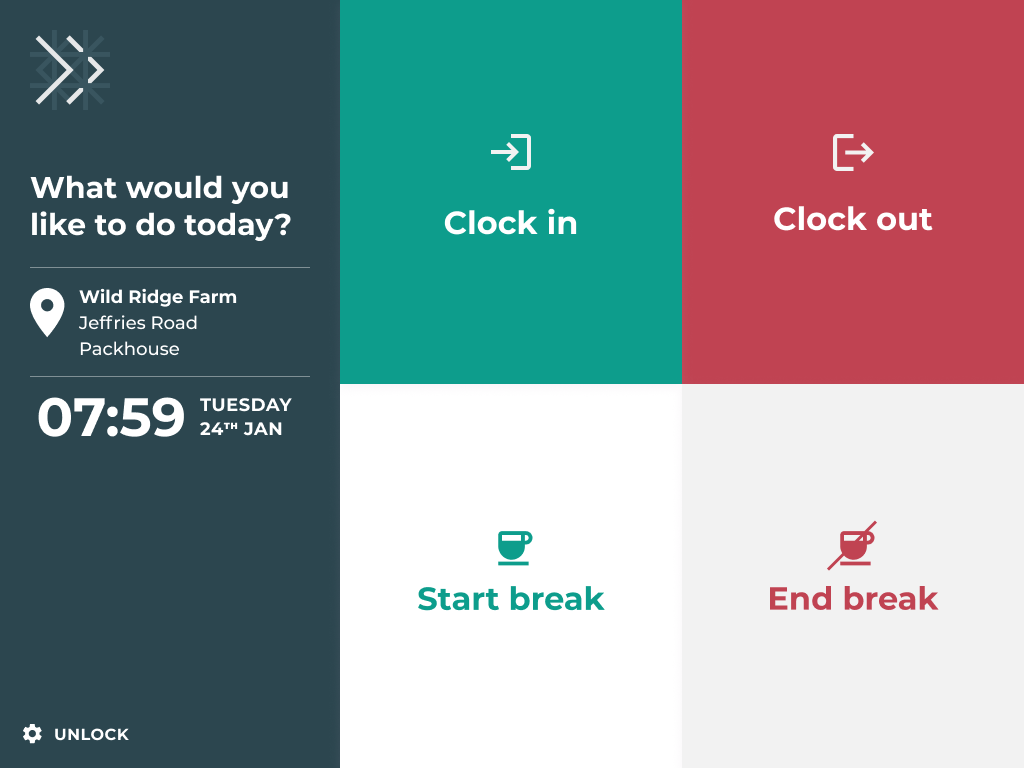 What would you like to do today? Tap the action; clock in or clock out and start break or end break