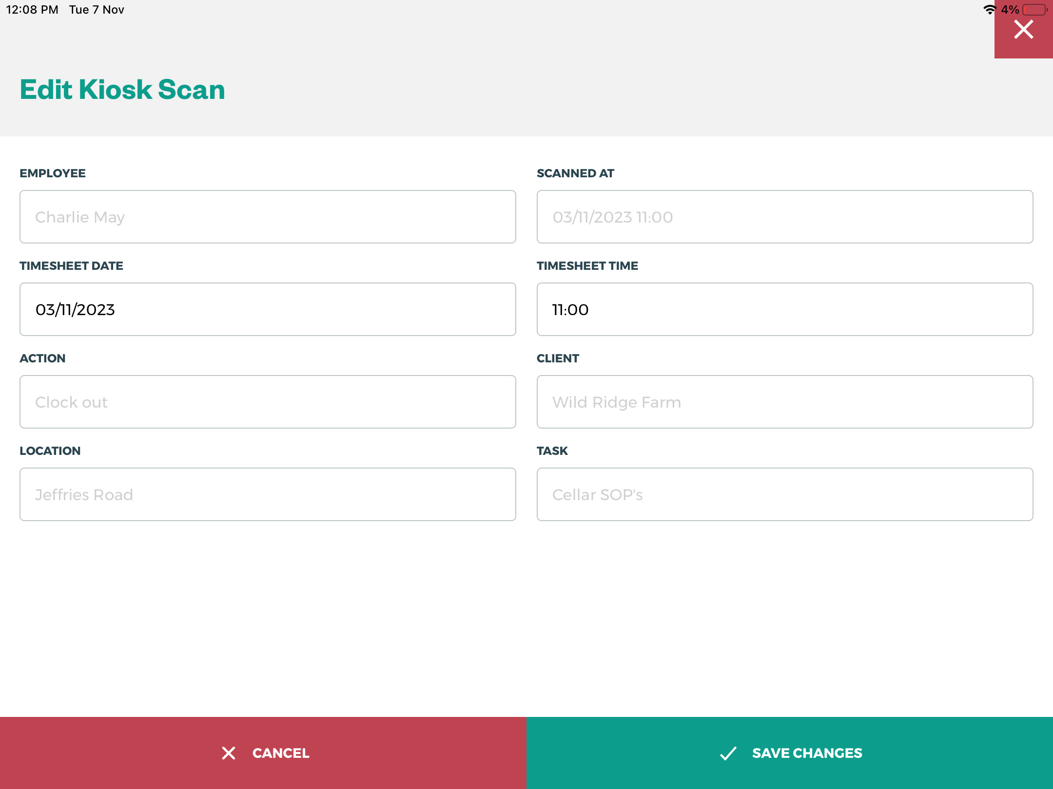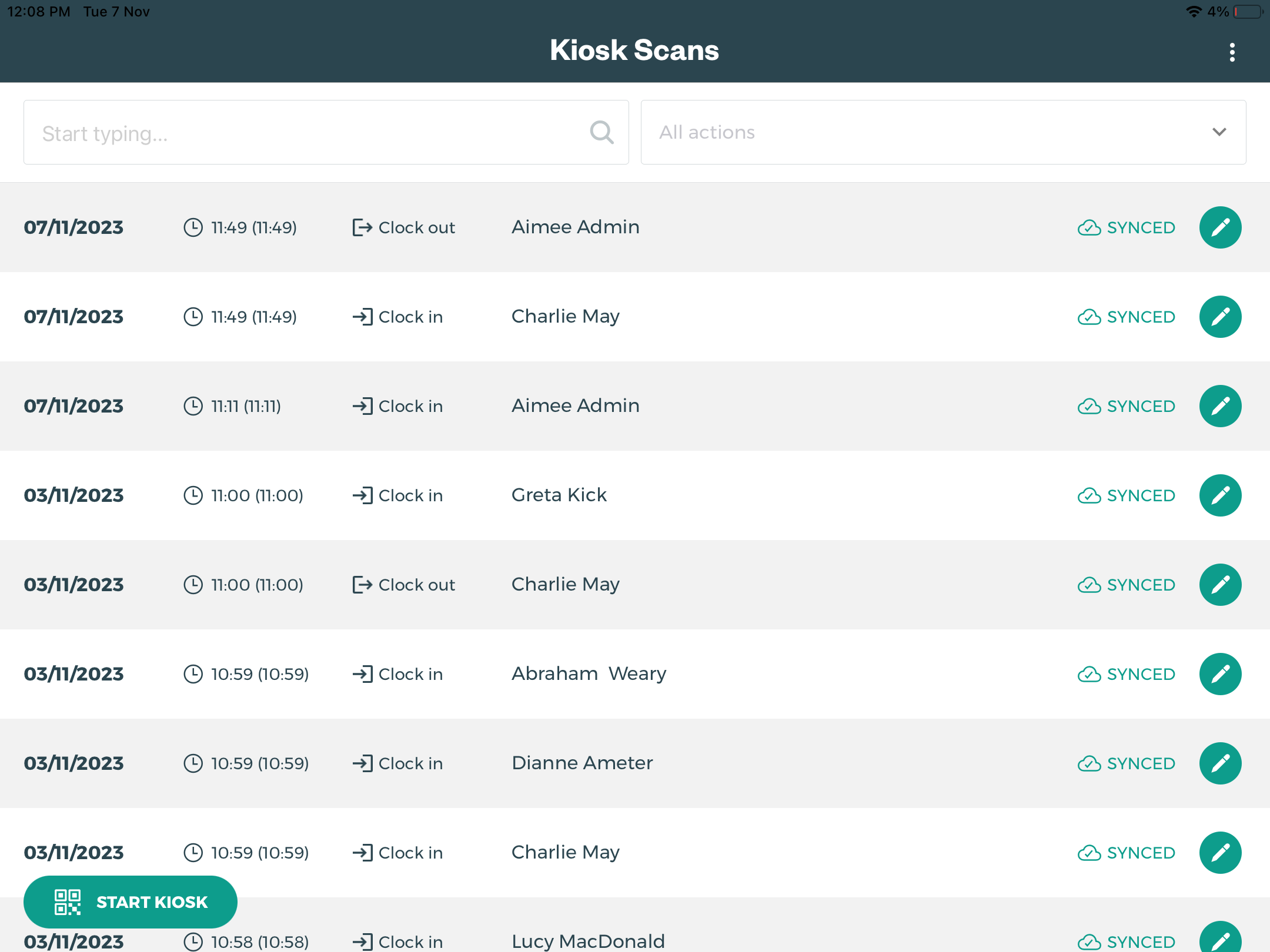Every action recorded is listed here in Kiosk Scans, they can be searched and filtered by action; clock in, clock out, start break and end break.