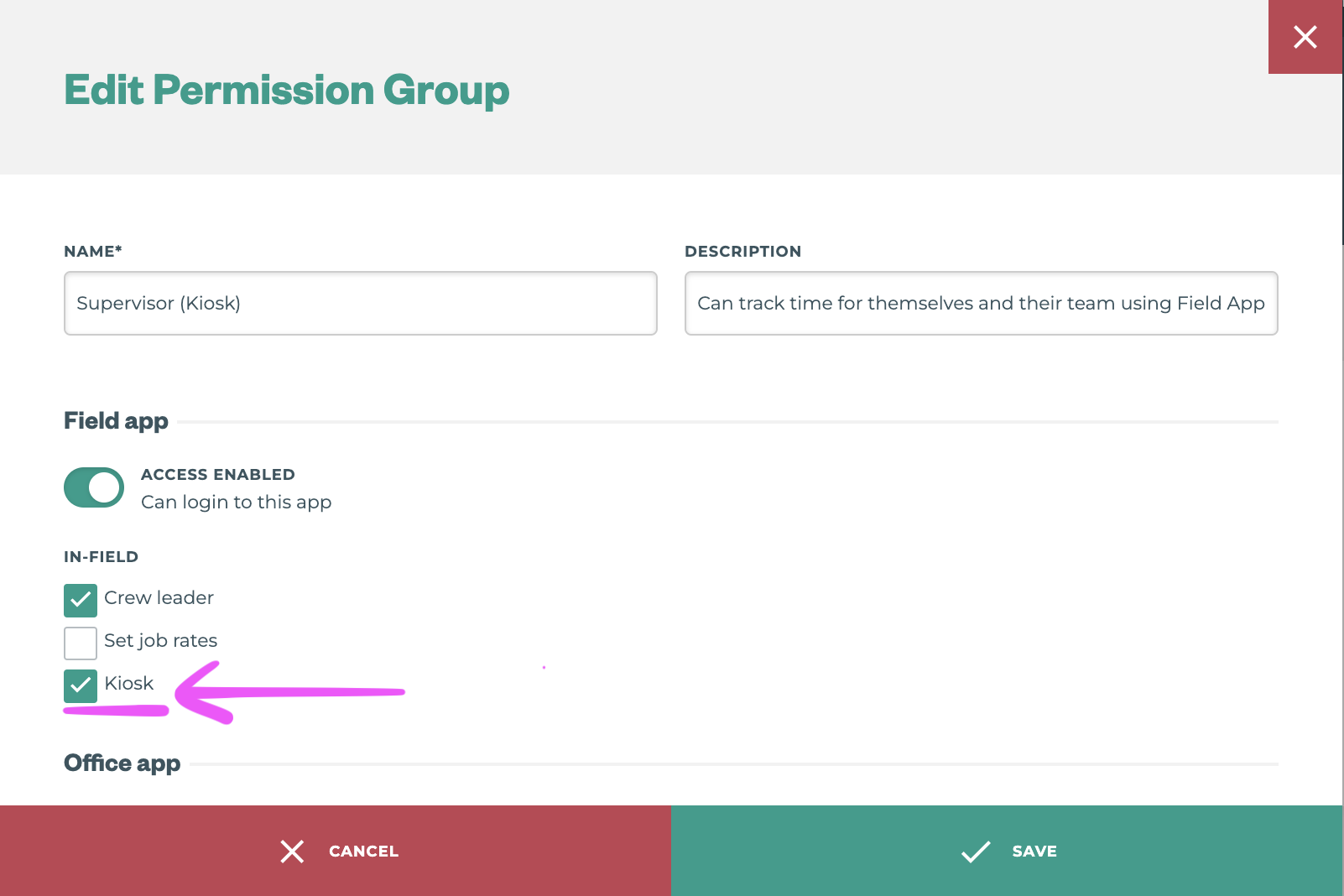 Login to the Office app, navigate to ⚙️ → Permissions to grant Kiosk access to relevant permission groups. If necessary, you can also +NEW permission groups.
