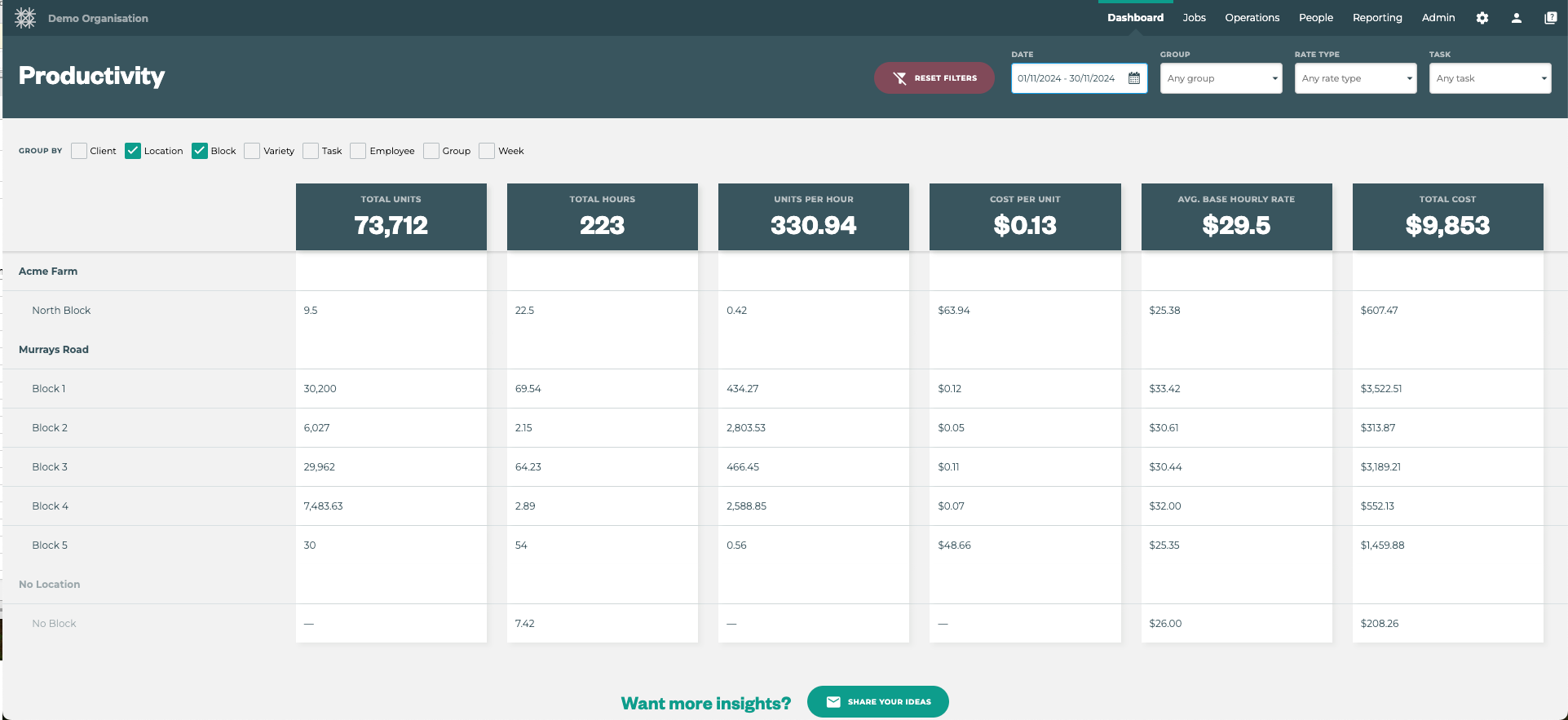 Grouped By: The default grouping is set to Location, however data reported can be grouped by any single item, a combination, or all of the grouping categories. Grouping includes: Client, Location, Block, Variety, Task, Employee, Group, and or Week.