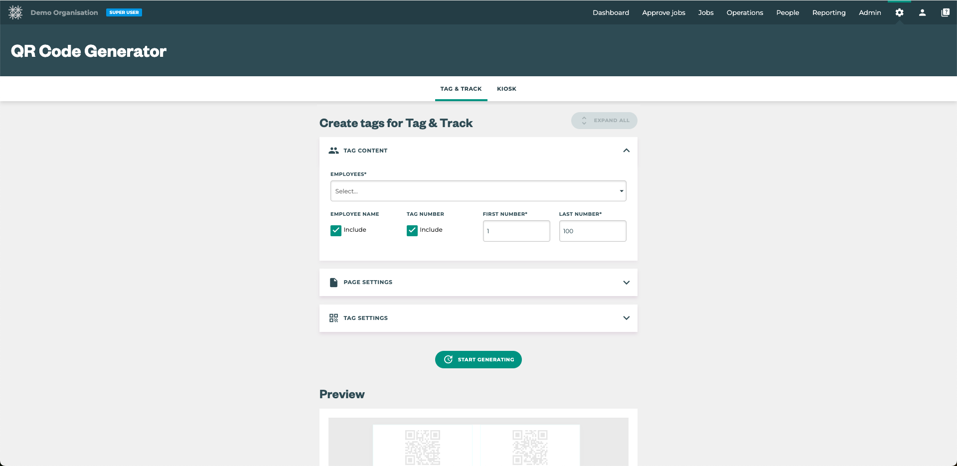The QR Code Generator page is where you create QR codes for your employees to use for either the Tātou Tag & Track or Kiosk Features: