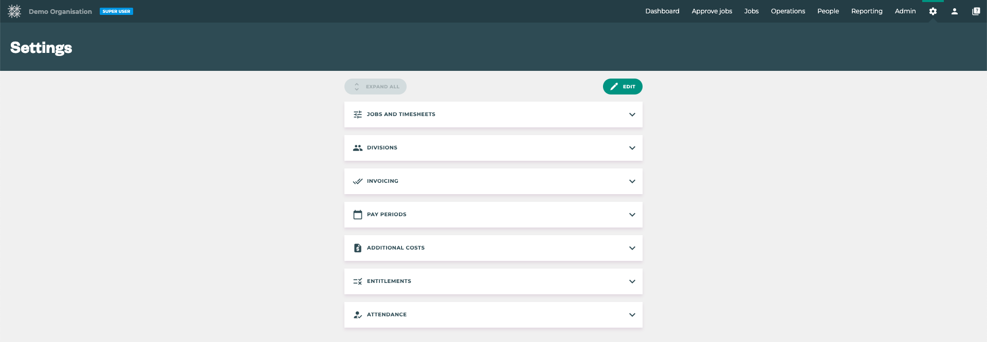 The Settings page is where you can set organisation wide settings, rules, rates, entitlements, that become applicable to other system features.