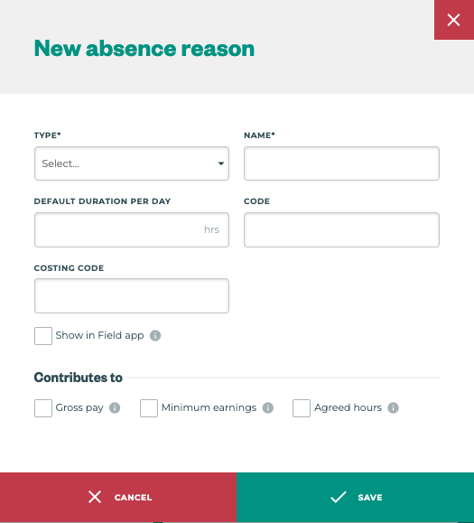 Attendance: Add Attendance Reasons here, and decide how these can apply to earnings, hours, etc.