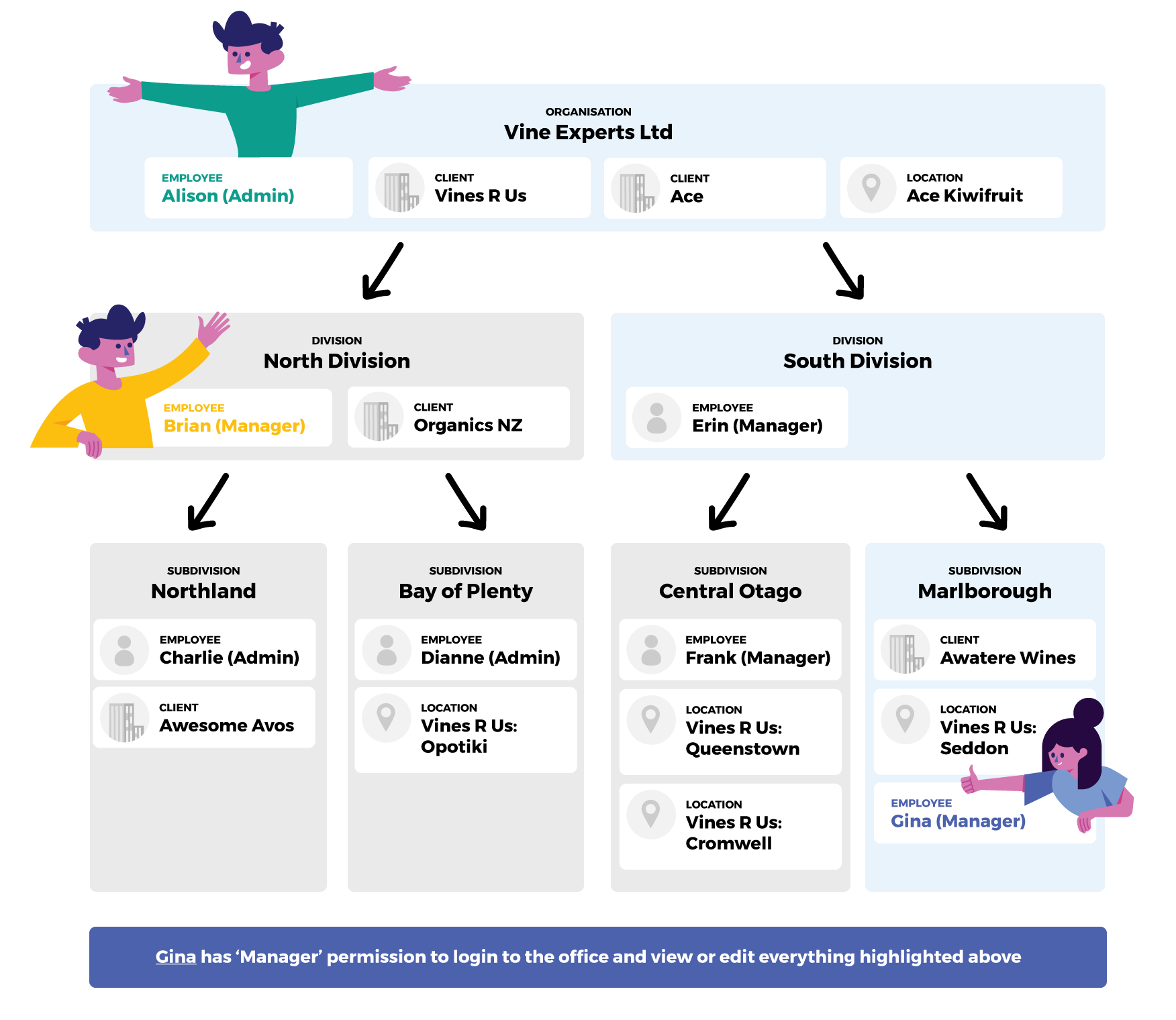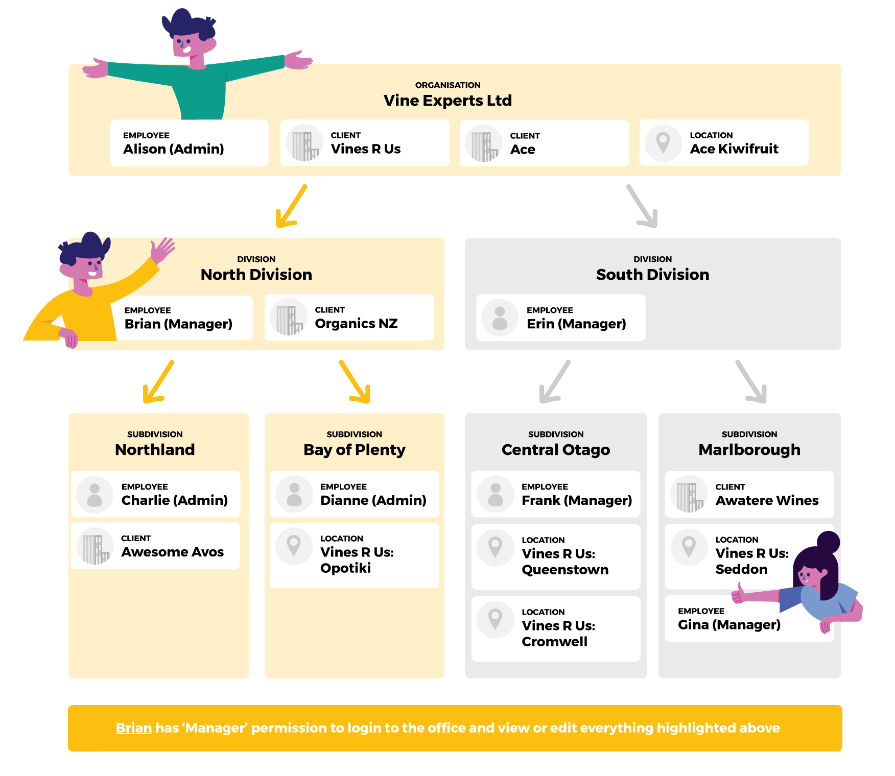 For example Dianne (Bay of Plenty) would not be able to see jobs or timesheets for her manager, Brian (North Island). But Brian can see Dianne's.