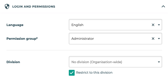 Division is where you select the Division you want this record (Client, Location or Employee) to belong to. Leave empty to keep it at the Organisation-level.